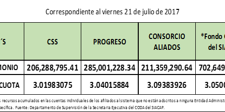 Jul252017CifrasValor Cuota Semanal Categoría: Cifras, Valor Cuota SemanalPor fiscalizacion25 julio, 2017 Comparte esta entrada Share on FacebookShare on Facebook Share on XShare on X Share on LinkedInShare on LinkedIn Share on WhatsAppShare on WhatsApp Pin itShare on Pinterest Autor: fiscalizacion Navegación entre publicacionesAnteriorPublicación anterior:Valor Cuota Semanal al Viernes 14 de Julio de 2017.SiguientePublicación siguiente:Rentabilidad eleva valor de fondos de pensiones y ya equivalen a casi tres cuartos del PIB chileno.Artículos RelacionadosValor Cuota Semanal31 agosto, 2017Valor Cuota Semanal al Viernes 25 de Agosto de 201730 agosto, 2017Valor Cuota al Viernes 18 de Agosto de 201723 agosto, 2017Valor Cuota al Viernes 11 de Agosto de 201716 agosto, 2017Valor Cuota al Viernes 4 de Agosto de 20179 agosto, 2017Valor Cuota al Viernes 28 de Julio de 2017.1 agosto, 2017