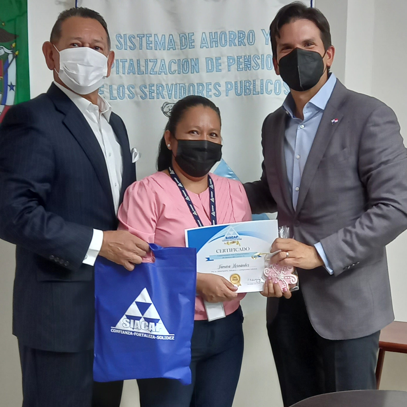 El Diacono Rodrigo Carrión Ayarza realizó la invocación religiosa, mientras que los Licenciados Juan Carlos Baquero y Rolando E. Mejía M., Presidente del Consejo de Administración del SIACAP y Secretario Ejecutivo entregaron reconocimientos al personal, destacando valores como: la puntualidad, don de servicio y compromiso durante la pandemia del Covid-19, época donde la atención a los afiliados se mantuvo.